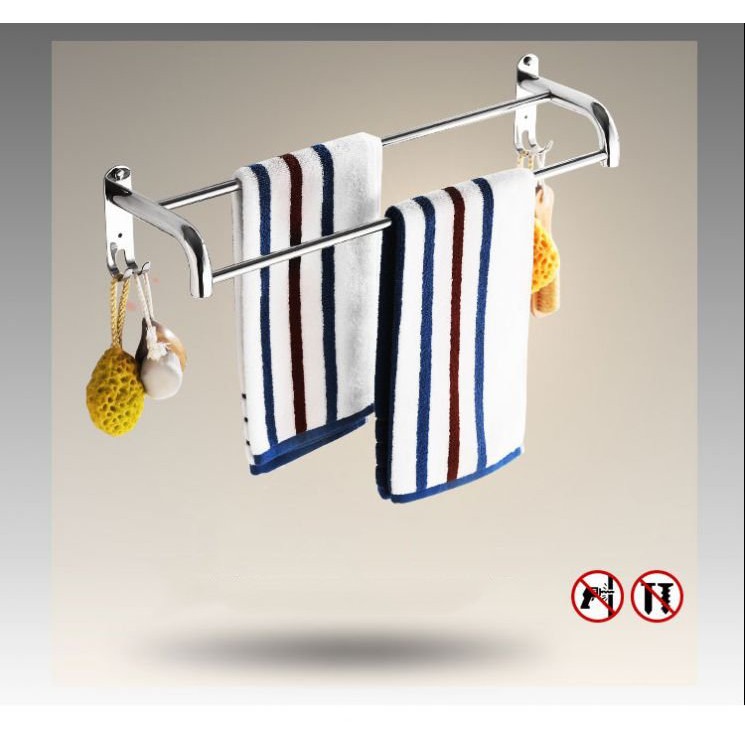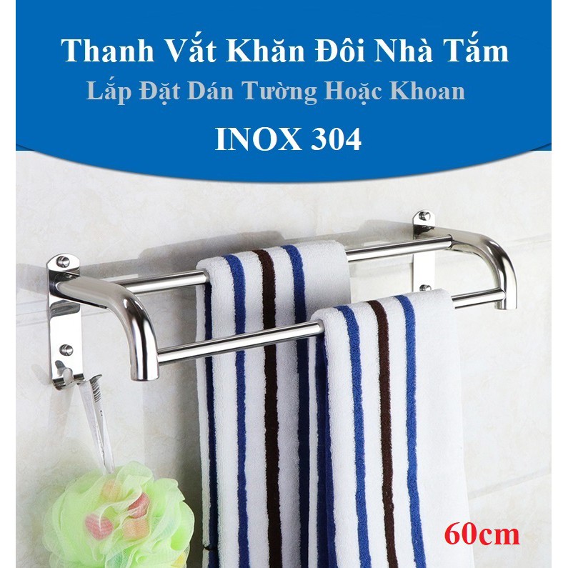 Giá Treo Khăn Phòng Tắm INOX 304, Thanh vắt khăn đôi nhà tắm kích thước 60cm lắp đặt dán tường gạch men - TTD60