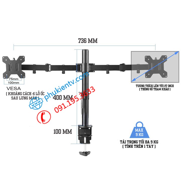 ✔ Chịu tải trọng lớn tới 9Kg / 1 tay phù hợp treo các loại màn hình từ 17 - 27 inch