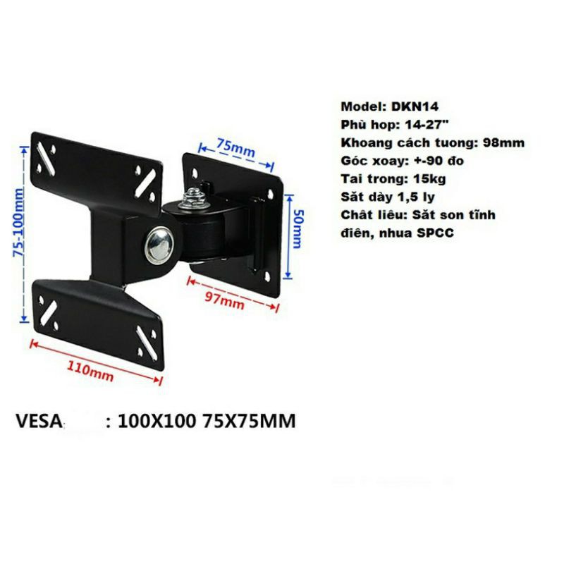 Phù hợp với tiêu chuẩn VESA 75mm và 100mm (nghĩa là, mặt sau của màn hình LCD là 75x75mm hoặc 100x100mm phù hợp để sử dụng)Màn hình LCD có thể được điều chỉnh theo một góc thích hợp
