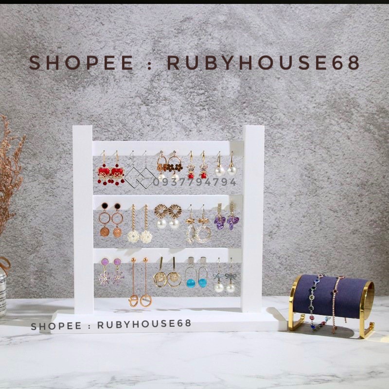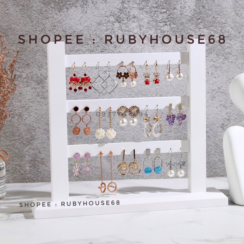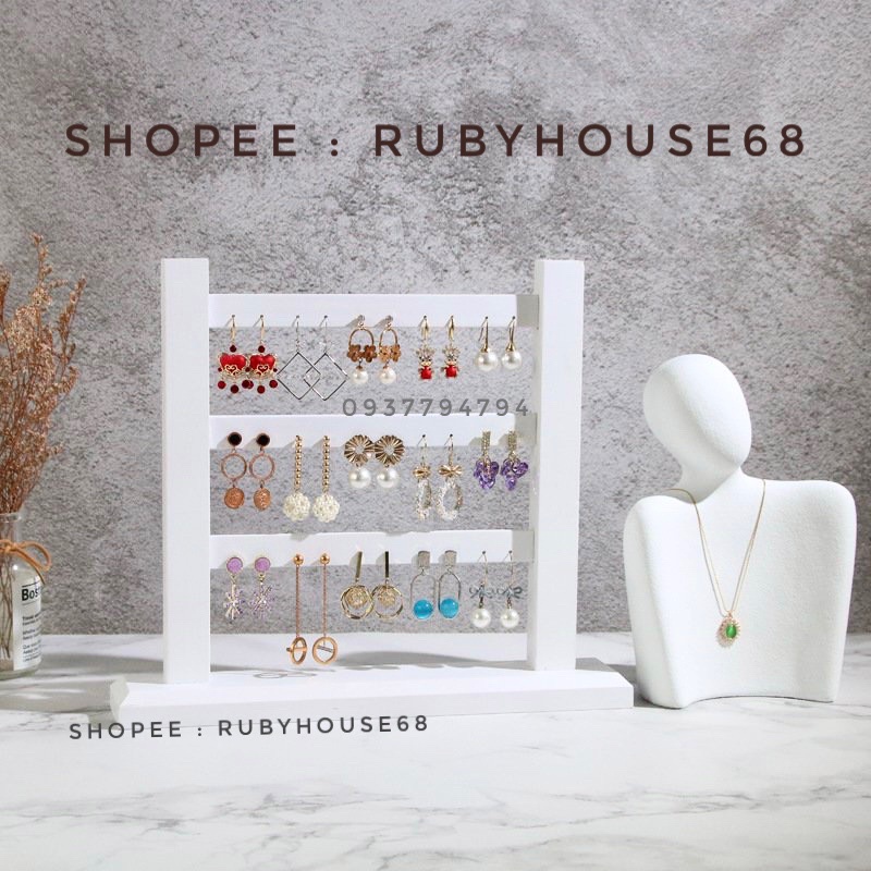 - Giá treo hoa tai : chất liệu gỗ sơn màu trắng , kích thước cao 26cm , ngang 30cm , 30 lỗ treo