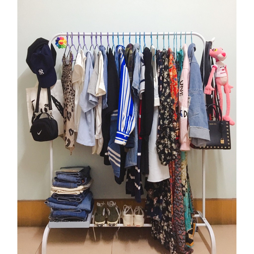 Gía treo quần áo thiết kế thêm 1 tầng có các thanh sắt ngang để đồ, ngoài việc treo quần áo còn có thể để được rất nhiều vật dụng lên tầng dưới của kệ áo như : Giày dép, túi sách, ba lô...