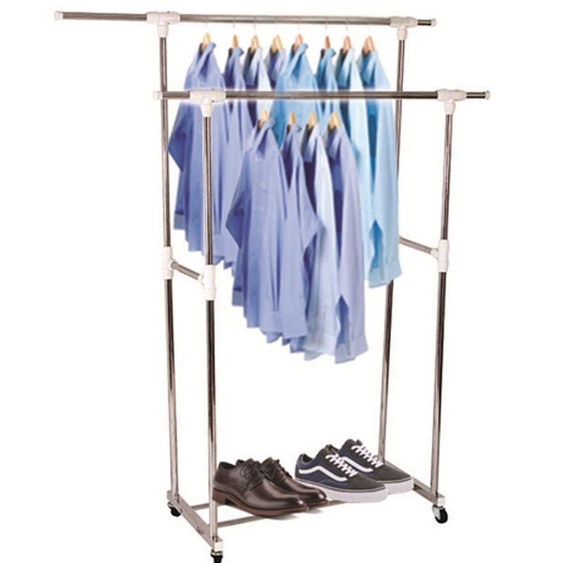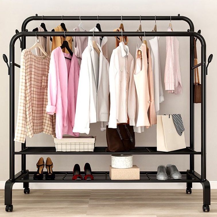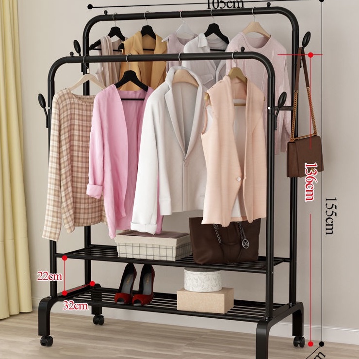 Gía treo quần áo thiết kế thêm 1 tầng có các thanh sắt ngang để đồ, ngoài việc treo quần áo còn có thể để được rất nhiều vật dụng lên tầng dưới của kệ áo như : Giày dép, túi sách, ba lô...