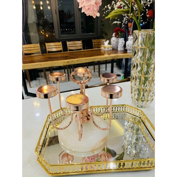Chất liệu thép không gỉ mạ vàng, vàng hồng. Chân đế bằng đá và pha lê vô cùng sang trọng và đẹp mắt
