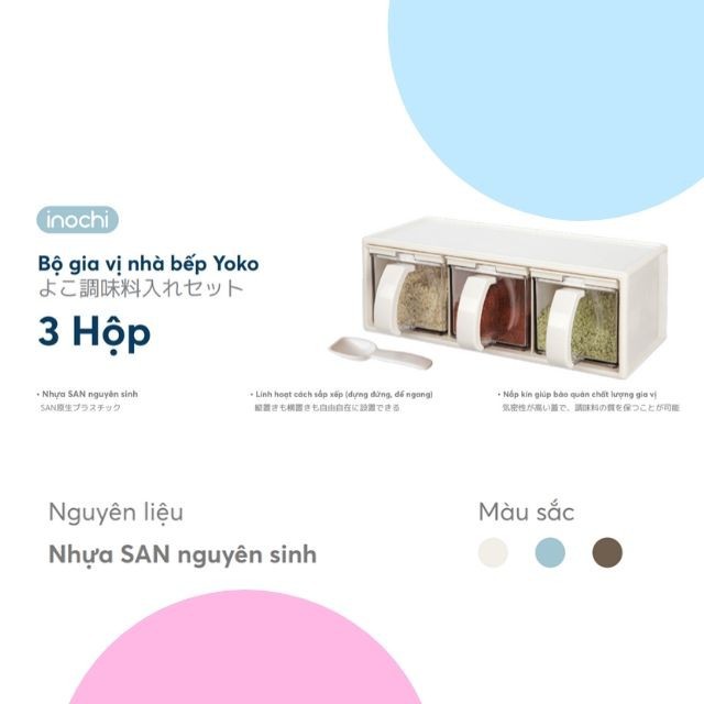 Bộ gia vị nhà bếp Yoko Inochi Nhật Bản 3 ngăn hàng chính hãng cao câp, kháng khuẩn, an toàn sức khỏe- Sản phẩm chính hãng Inochi (Thương hiệu nhựa gia dụng cao cấp Phong cách & Tiêu chuẩn Nhật.