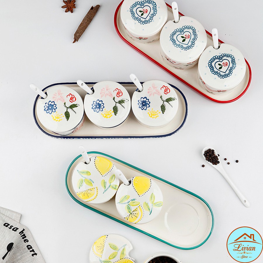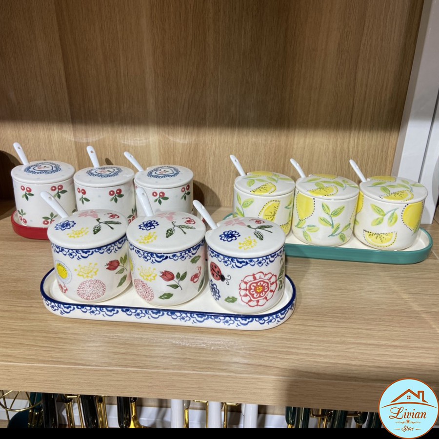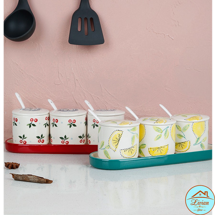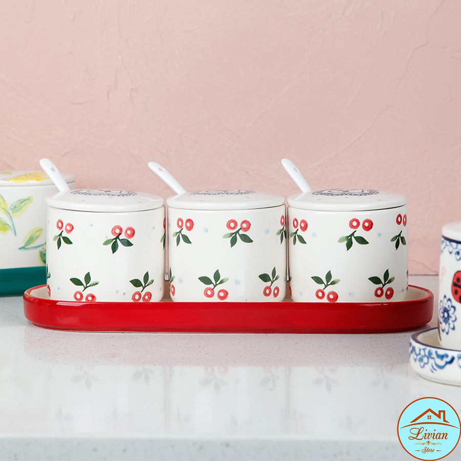 Bộ gia vị sứ 3 lọ kèm khay thìa họa tiết cherry- chanh vàng- hoa lá