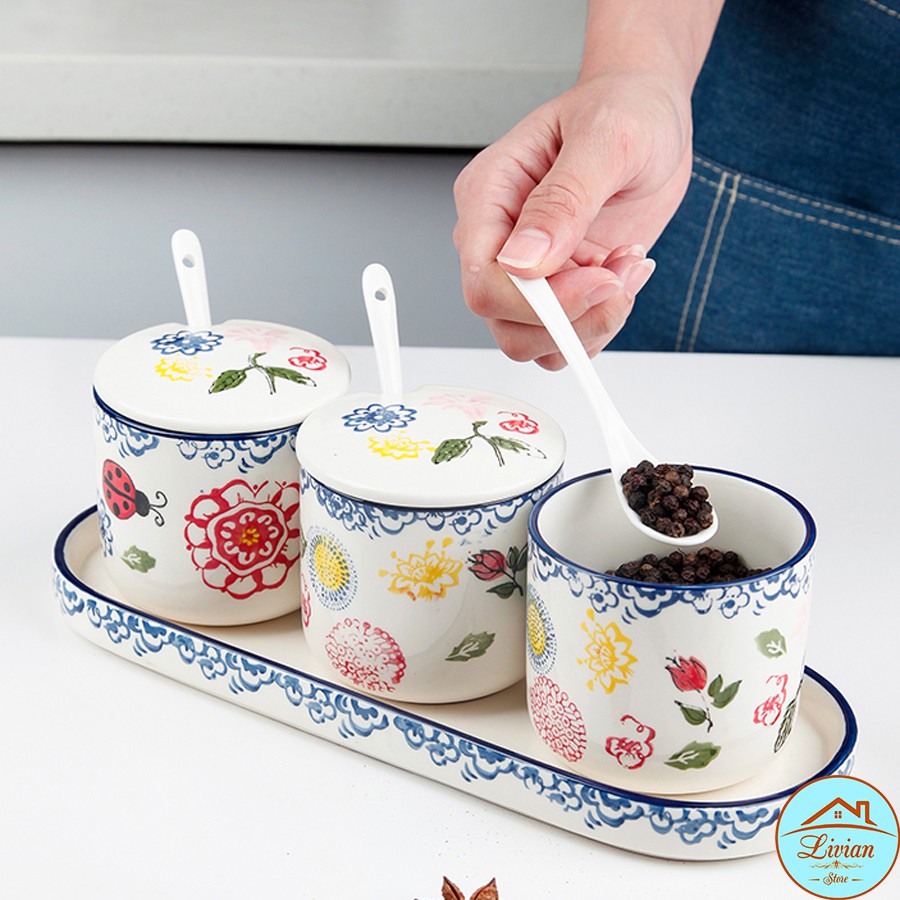 + Bộ gia vị sứ được thiết kế các họa tiết vẽ tay độc đáo tô điểm thêm điểm nhấn cho căn bếp của bạn.