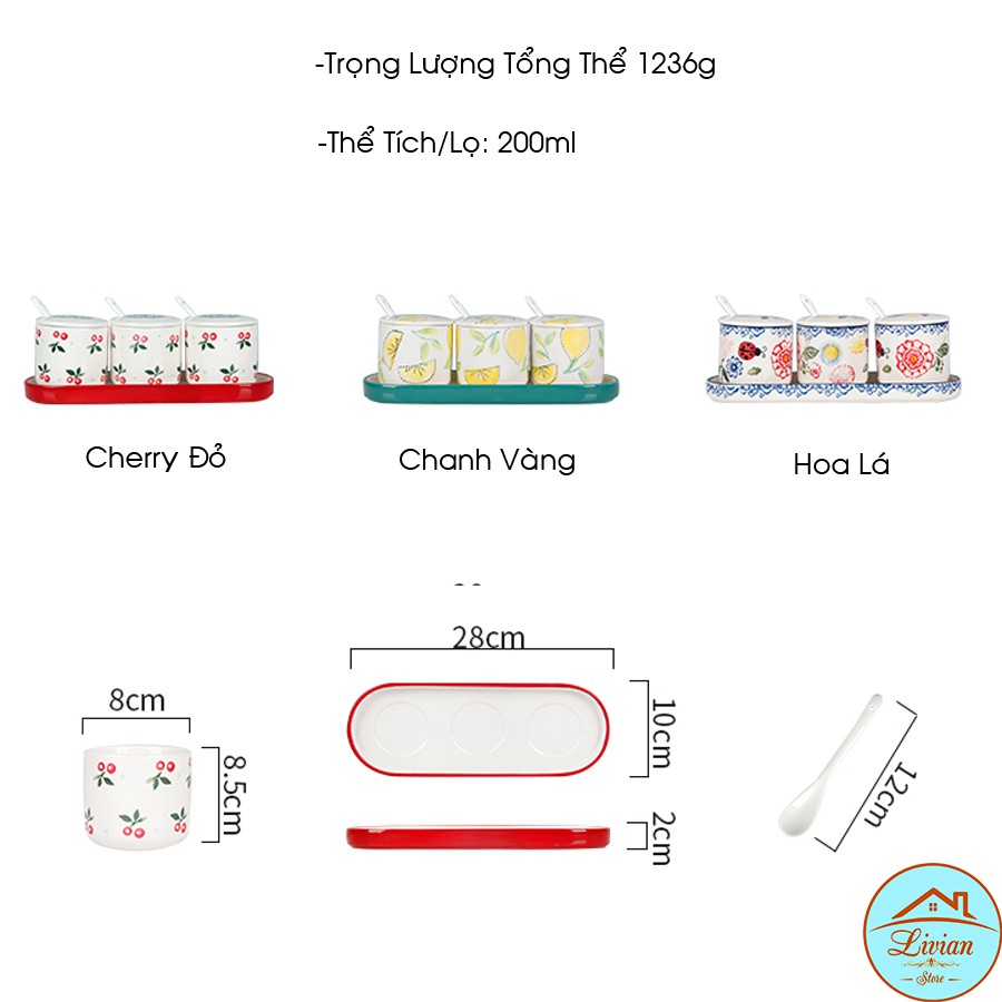 + Bộ gia vị sứ 3 lọ kèm khay thìa có 3 họa tiết: Cherry đỏ, chanh vàng và họa tiết hình hoa lá.
