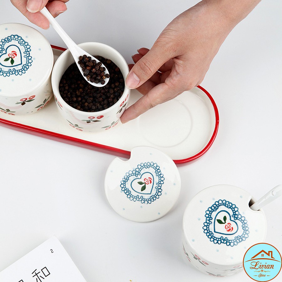 Giới thiệu Bộ gia vị sứ 3 lọ kèm khay thìa họa tiết cherry- chanh vàng- hoa lá