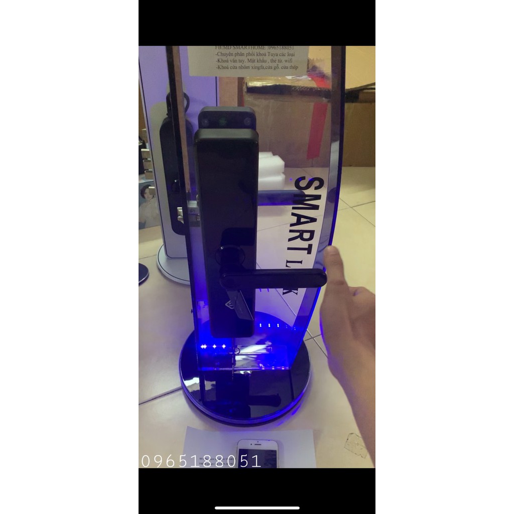 Demo Giá để khoá vân tay Tuya bản cao cấp có ánh đèn kết hợp. Giá đỡ chắc chắn trong suốt khung quay nhẹ nhàng để làm demo cho showrom của bạnGiá DONALD