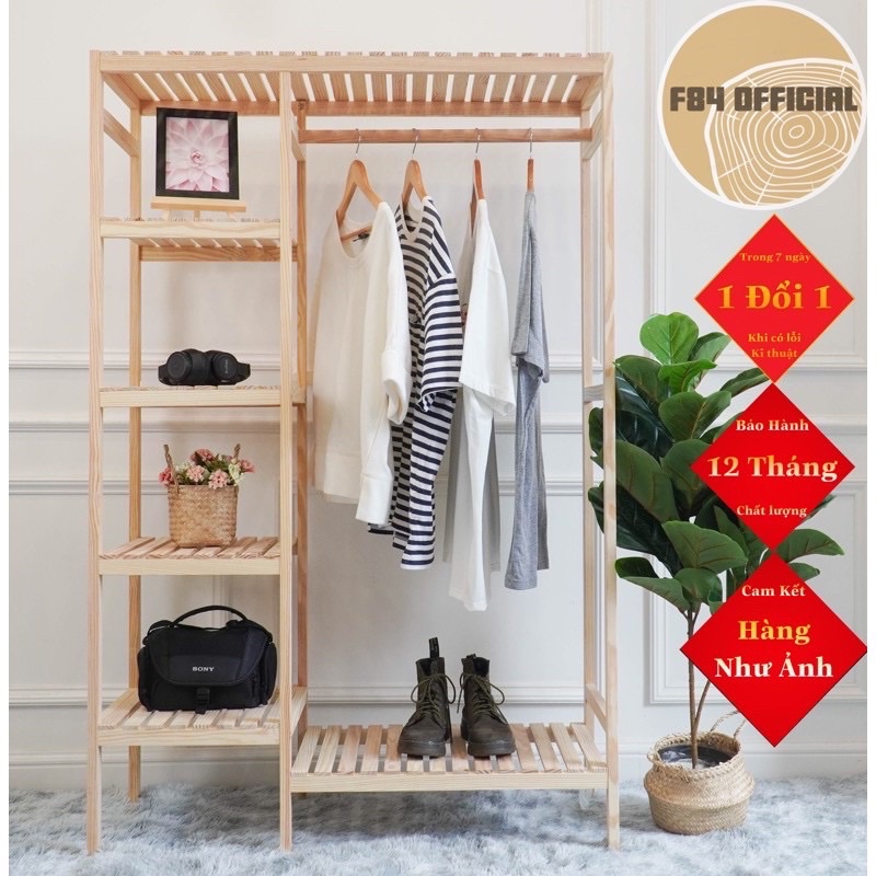 - Giá kệ gỗ treo quần áo có thiết kế thông minh, tiện lợi khi sử dụng: vừa treo móc được nhiều quần áo, có thêm ngăn kệ ngang chia tầng bằng gỗ bản lớn chắc chắn, để chứa giày dép hoặc cất giữ các đồ vật nặng. Tiết kiệm diện tích không gian.