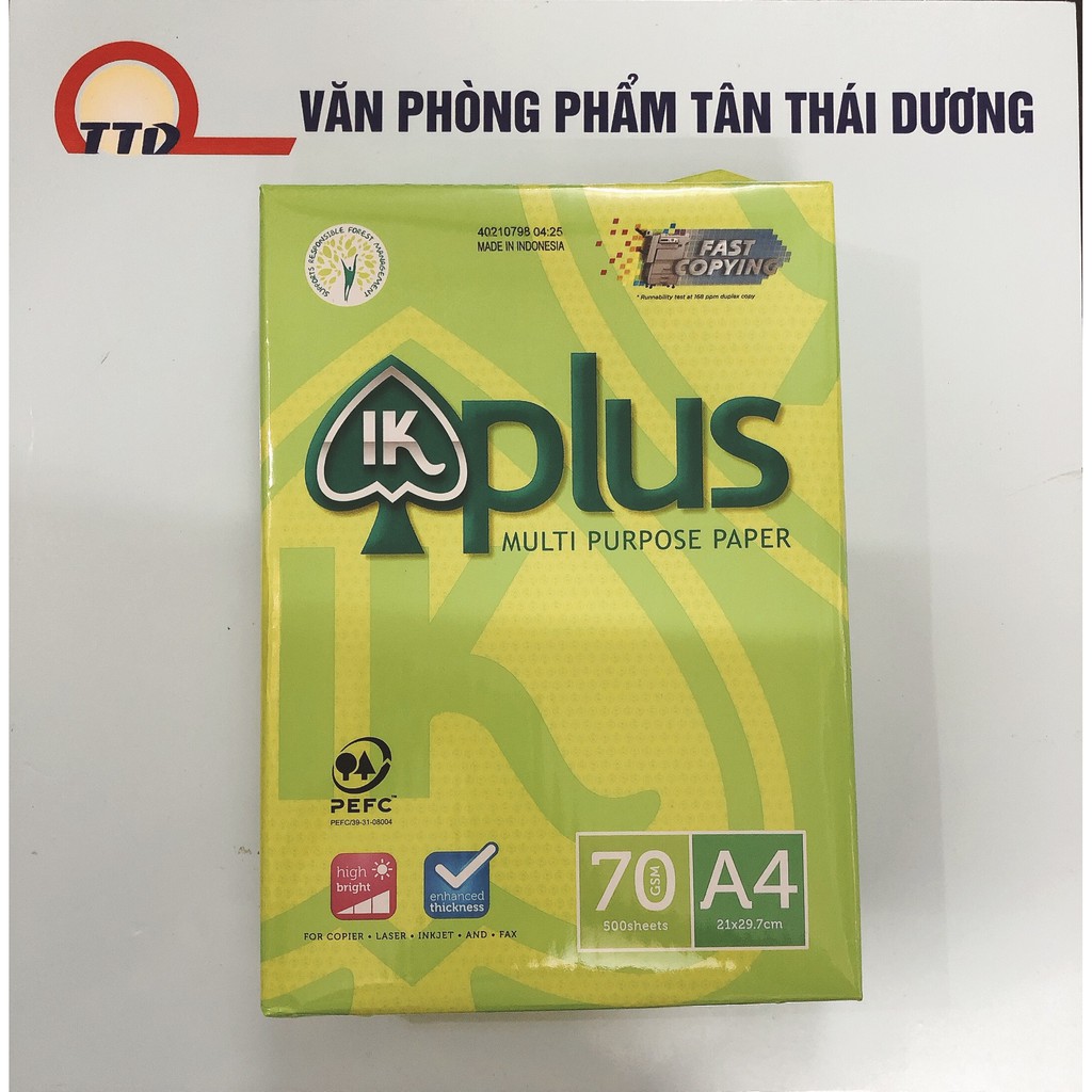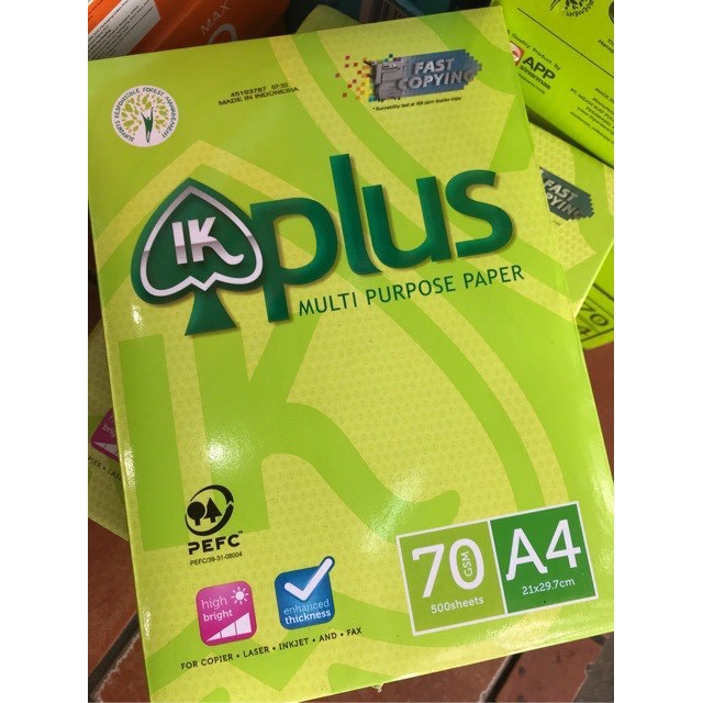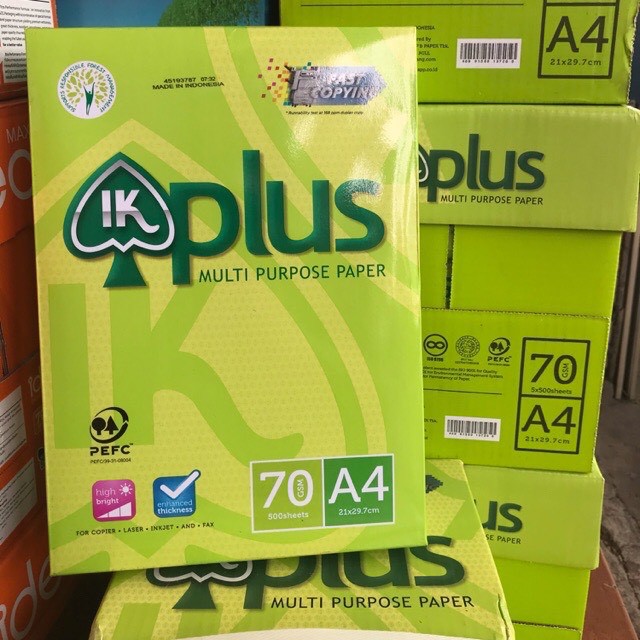 - Loại giấy trắng đẹp, thích hợp với tất cả các loại Máy in phun, Máy in Laser, Máy Fax laser, Máy Photocopy. In đảo 2 mặt không lo kẹt giấy. Giấy được đóng gói và nhập khẩu từ Indonesia nên Giấy IK Plus A4 – 70gsm luôn đảm bảo chất lượng cũng như độ ổn định.
