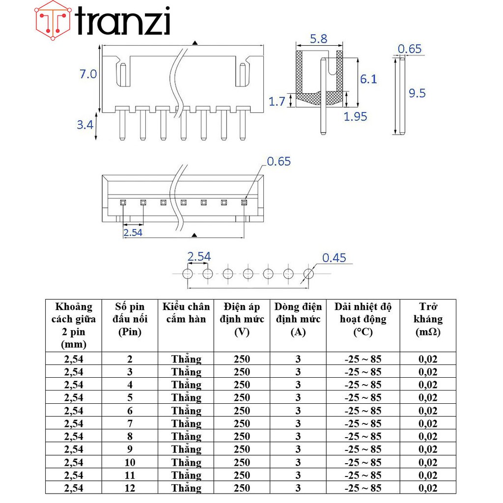 - Khoảng cách giữa 2 pin (mm): 2,54