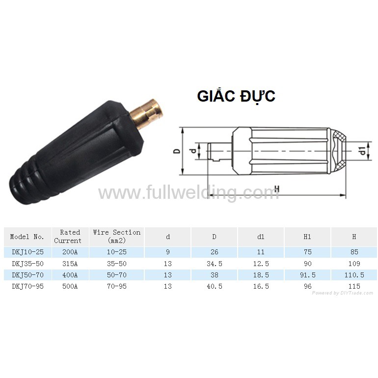 + Giắc nối DKJ 35-50: Dùng để lắp dây cáp hàn có tiết diện 50mm2 trở lại