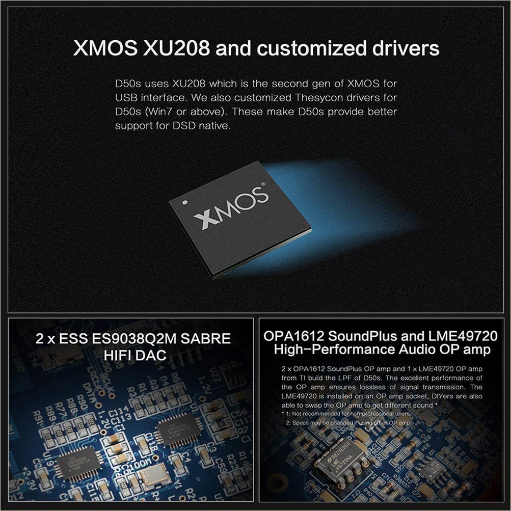 DSD Topping D50s sử dụng 02 chip ES9038Q2M + 01 chip XMOS (XU208) + 03 chip OPA1612 để giải mã tín hiệu âm thanh. Topping D50s được thiết kế để hoạt động tốt với hệ điều hành window 7 hoặc mới hơn. Với hệ thống linh kiện chất lượng cao, đến từ các nhà sản xuất danh tiếng, Topping D50s hỗ trợ nghe nhạc lossless 32bit/768kHz, đồng thời hỗ trợ nhạc chất lượng cao chuẩn DSD512. Giống như các loại dac nghe nhạc DSD khác, chỉ hỗ trợ nghe nhạc DSD từ cổng USB, nếu bạn sử dụng cáp Coaxial hoặc cáp Optical . Topping D50s chỉ giới hạn ở PCM 48khz.