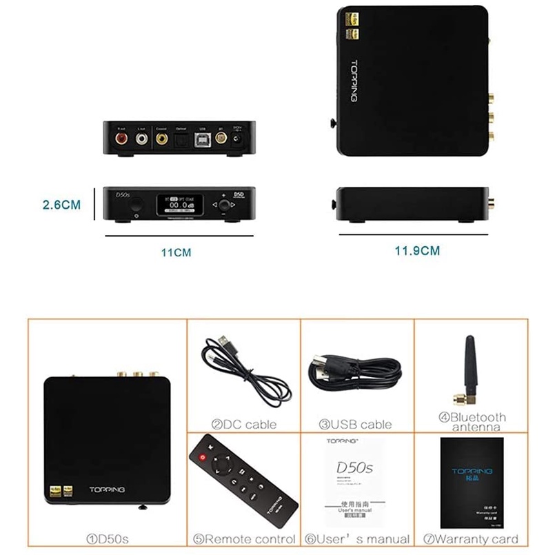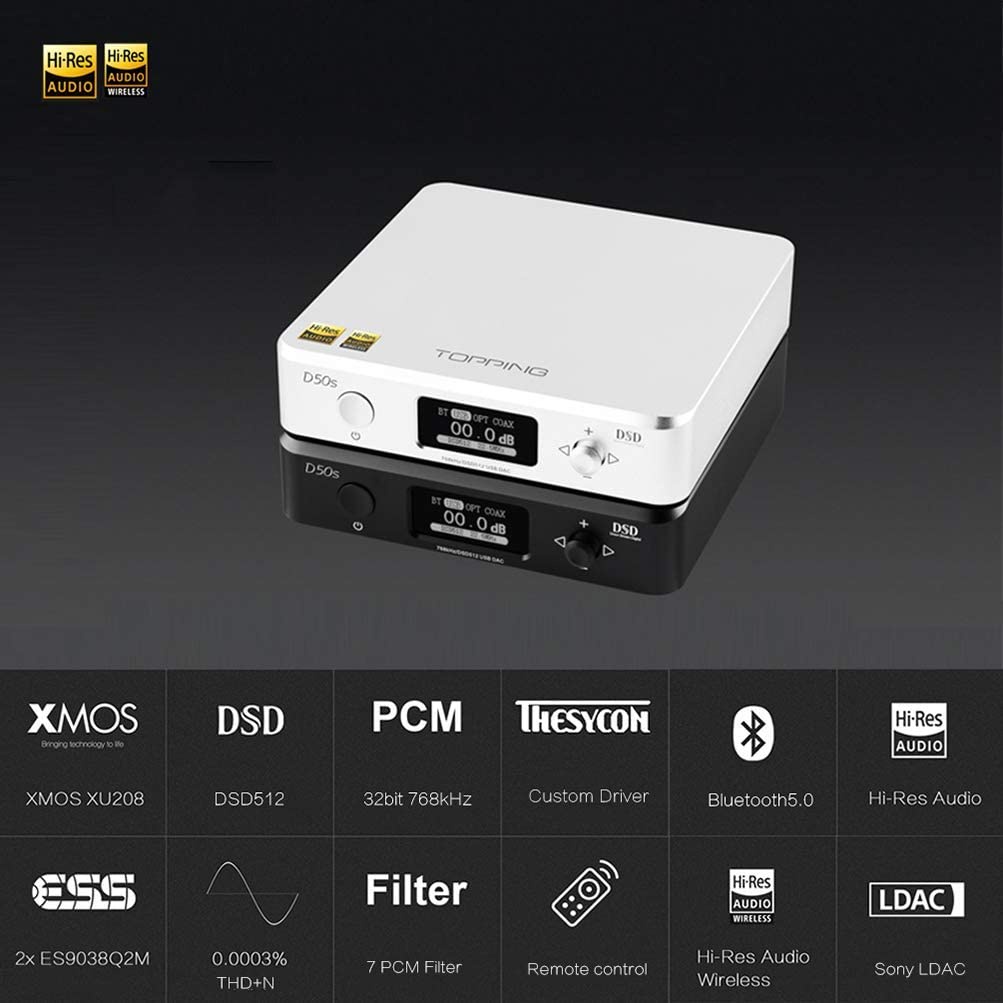 Topping D50s Bluetooth HiFi Decoder DAC DSD512 32Bit/768KHzNối tiếp thành công D50, Năm 2019 hãng Topping phát triển sản phẩm D50S.Thay đổi lớn nhất là bộ thu Bluetooth, Topping sử dụng chip Bluetooth tốt nhất hiện có trên thị trường CSR8675 từ Qualcomm - thiết bị này có khả năng nhận AAC, SBC, aptX, aptX-LL, aptX-HD và LDAC cho đến Truyền không dây 990 Kb / giây. Đây là con chip có khả năng Bluetooth 5.0 cộng với ăng-ten đi kèm chắc chắn sẽ giúp ích rất nhiều trong việc duy trì tín hiệu không dây ổn định và sạch sẽ (khoảng cách tầm 30m).