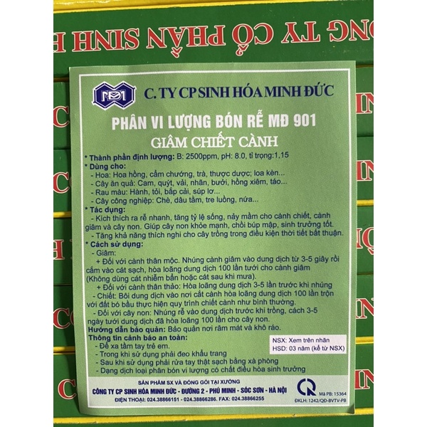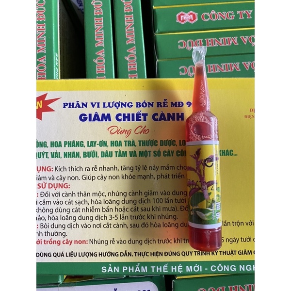 Thuốc giâm chiết cành - Phân bón vi lượng MĐ-901 được cung cấp bởi Công ty cổ phần sinh hóa Minh Đức có tác dụng kích thích cây ra rễ. Thích hợp trong quá trình nhân giống nhiều loại hoa cây cảnh.Một số loài cây nhân giống bằng cách giâm chiết cành