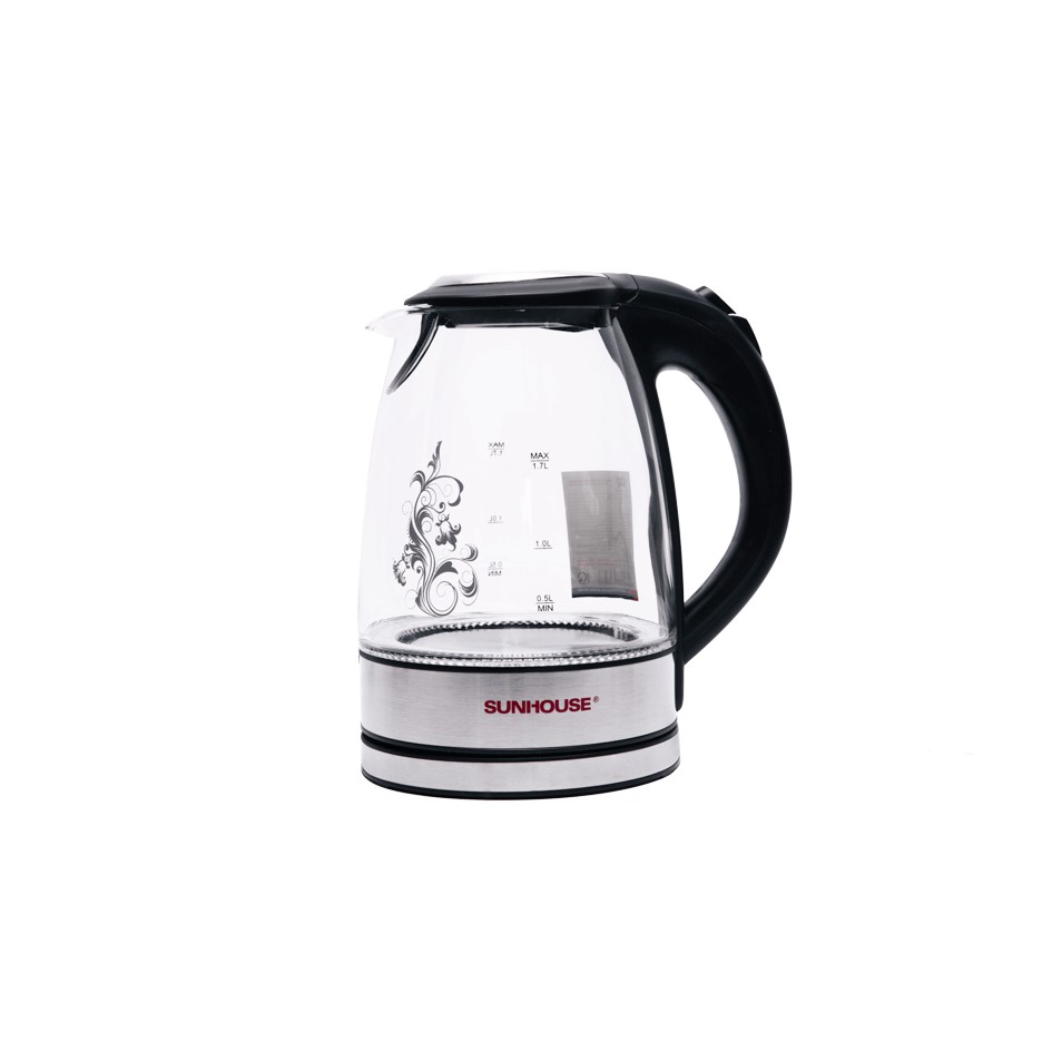 Ấm siêu tốc SUNHOUSE 1.7 L SHD1217 có kiểu dáng đẹp, sang trọng. Thân ấm bằng thủy tinh chịu nhiệt trong suốt, hoa văn bắt mắt, tính thẩm mỹ cao, không bị oxi hóa nên rất an toàn cho sức khỏe và tiện lợi khi vệ sinh.