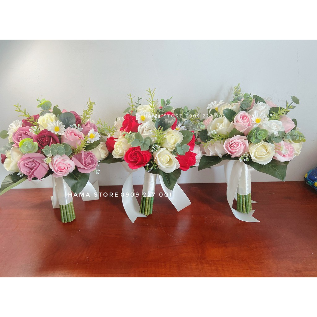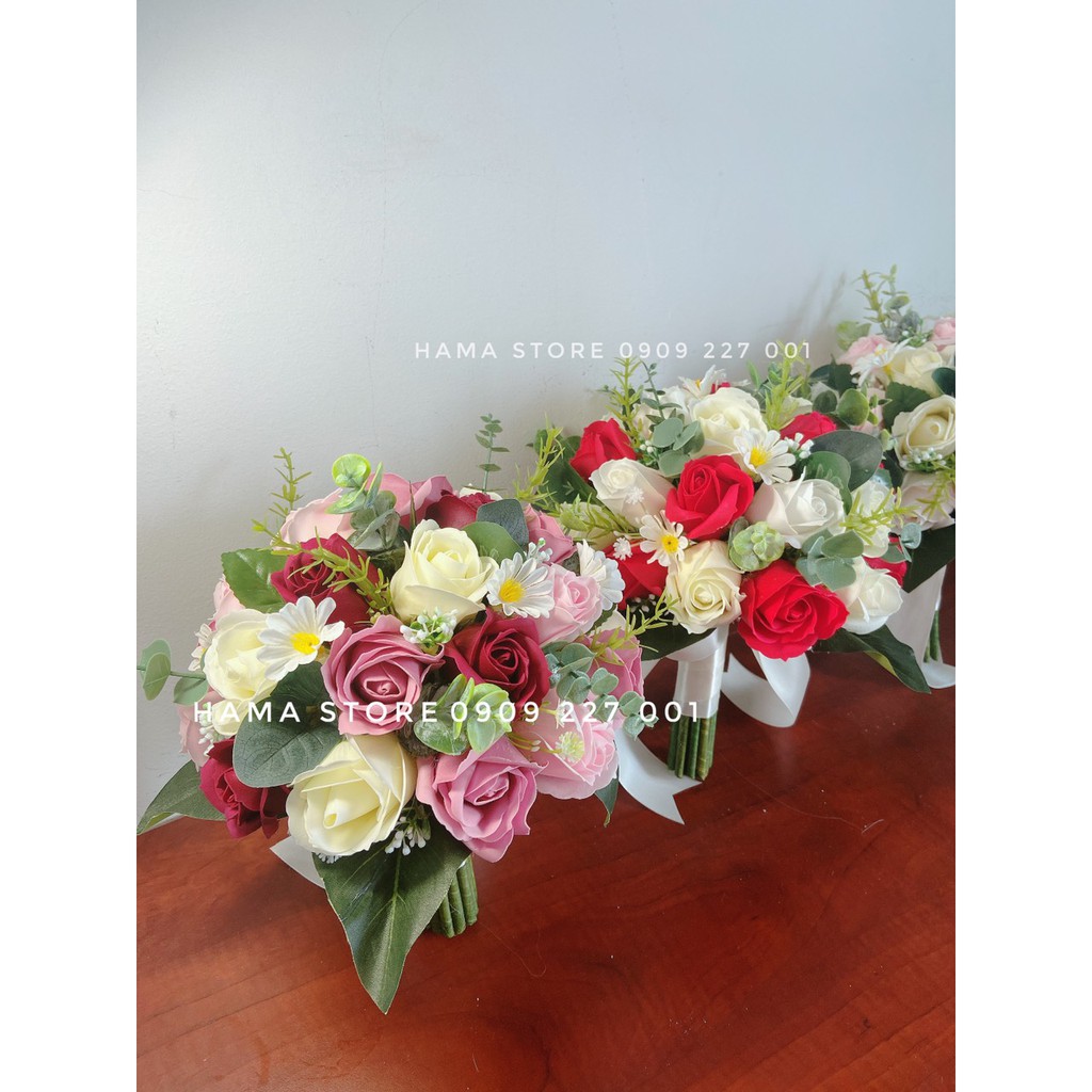 [GIAM8KFOLLOWER] - BÓ HOA CƯỚI CẦM TAY CÔ DÂU SÁP THƠM MÀU ĐỎ MÀU KEM ĐIỂM CÚC HỌA MI VÀ LÁ TÁO GIÁ RẺ CHỤP HÌNH CƯỚI