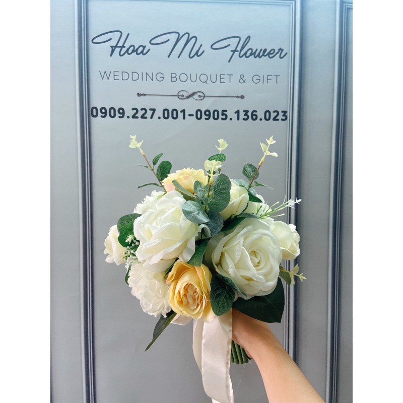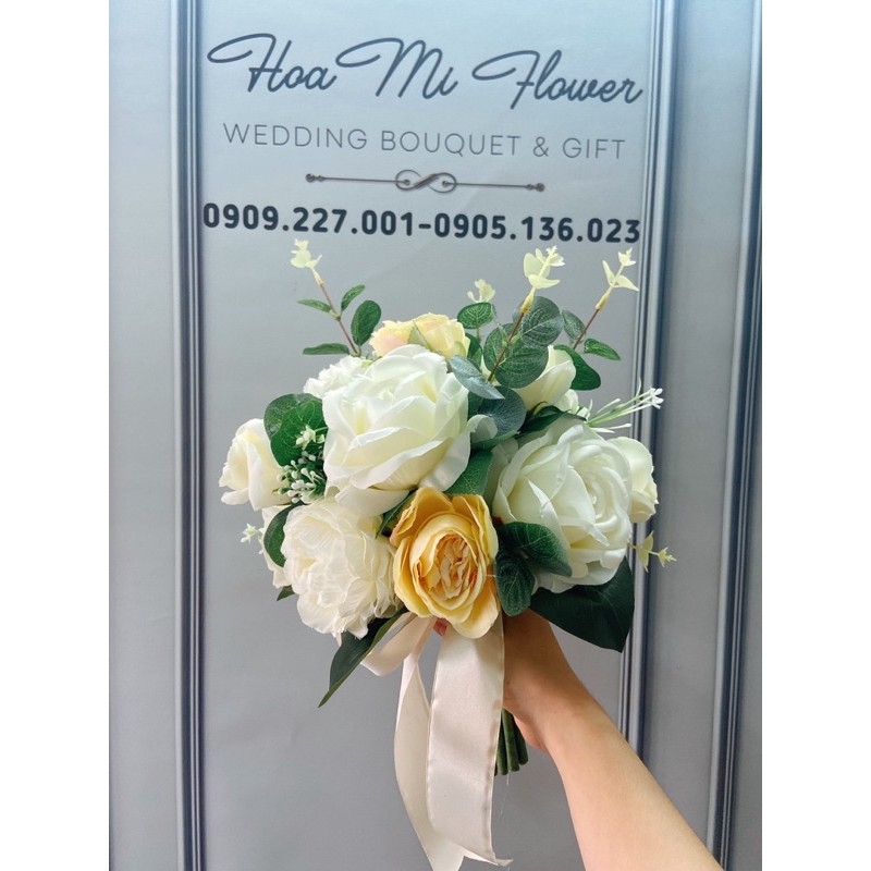 [GIAM8KFOLLOWER] - Hoa cầm tay cô dâu lụa cao cấp vải lụa phối cùng hoa Hồng sáp thơm Shop xu hướng cưới