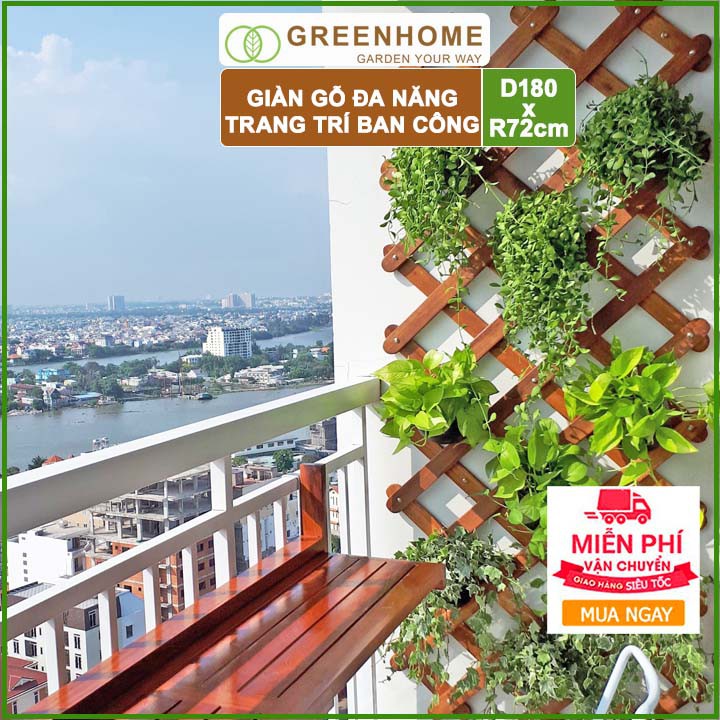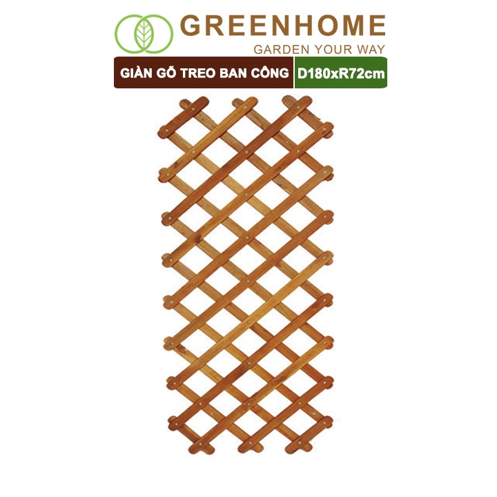 Giới thiệu Giàn gỗ treo ban công, R72xC180cm, gỗ tràm siêu bền, màu gỗ, co giản được, làm khung hoa hồng leo, bông giấy |Green
