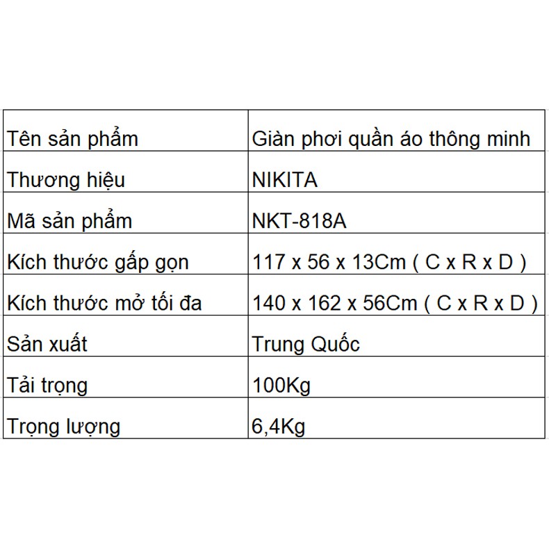 Thương hiệu: Nikita | Xem thêm các sản phẩm Giá, kệ phơi quần áo của NikitaMô tả ngắn