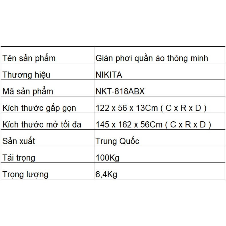 Thương hiệu: Nikita | Xem thêm các sản phẩm Giá, kệ phơi quần áo của NikitaMô tả ngắn