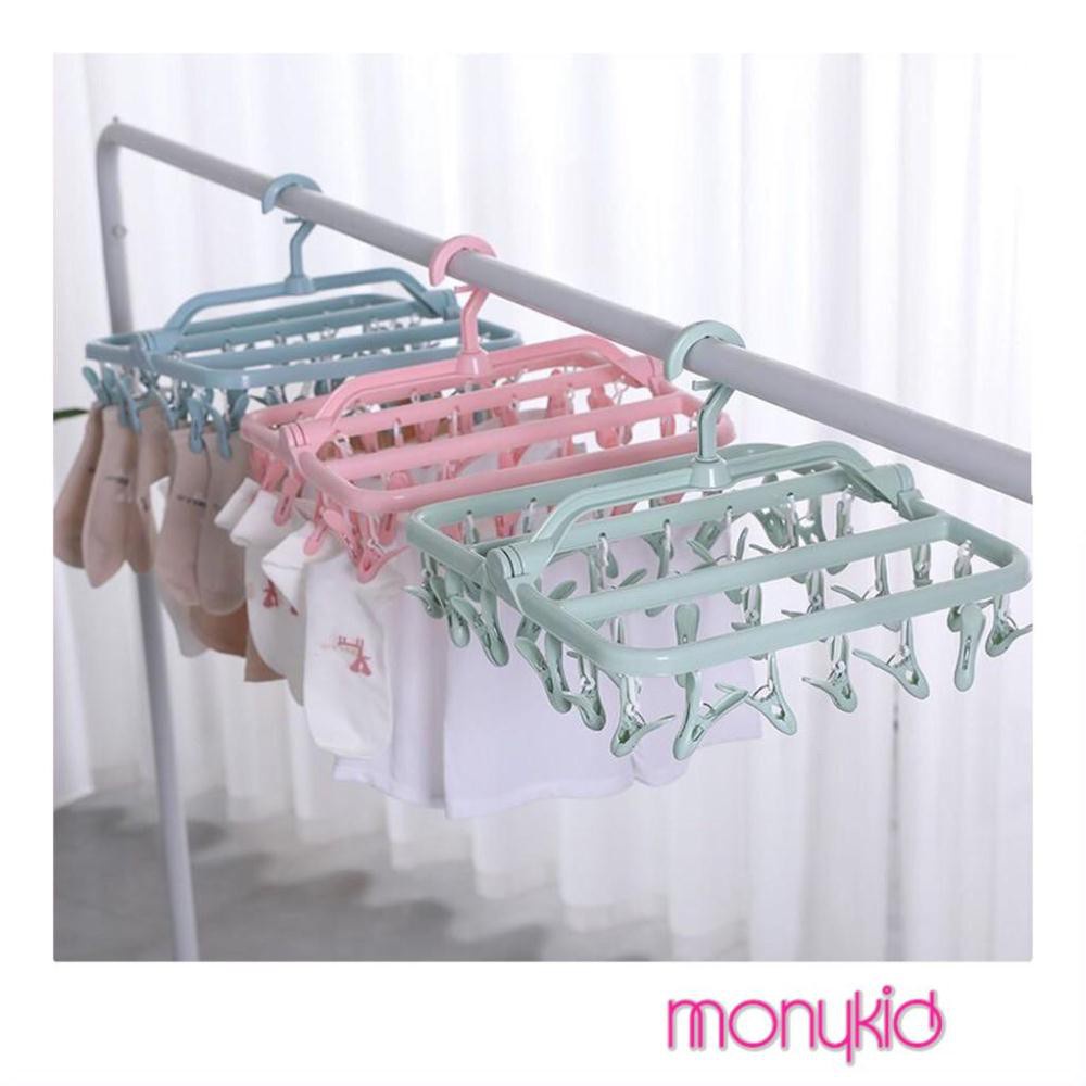 - Móc gồm 32 chiếc kẹp nhỏ giúp bạn phơi khăn tay, tất, găng tay, khăn len của bé mà không lo bị rơi dù trời gió to.