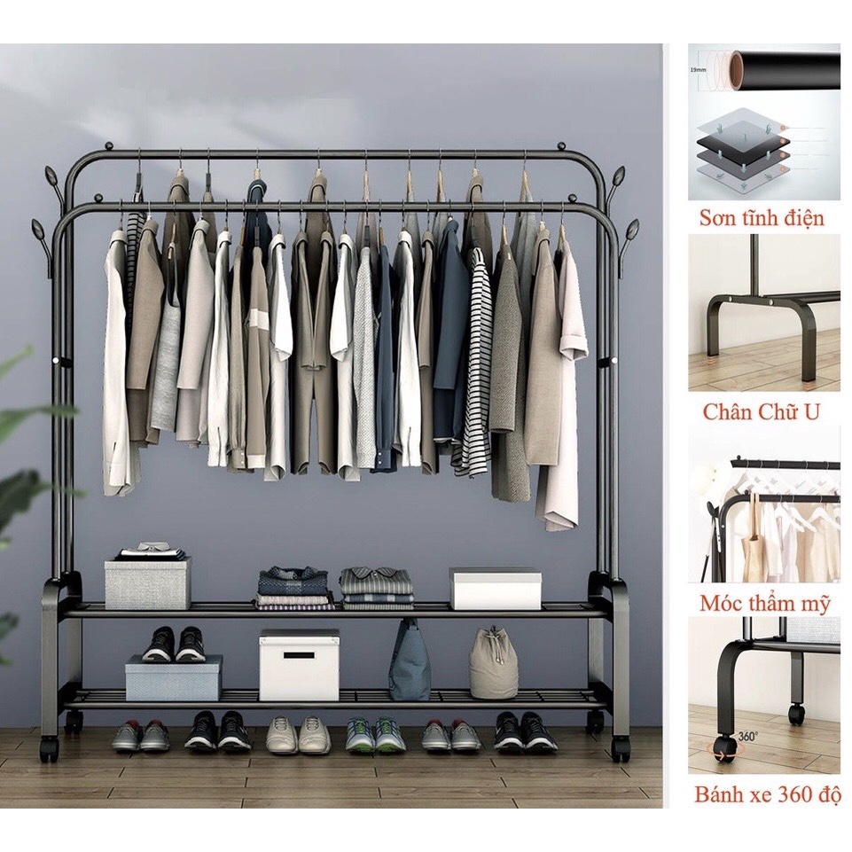 Dàn treo quần áo đôi thép đen thiết kế đa năng có thể treo quần áo, bên dưới để giày dép, các vật dụng sinh hoạt Giàn treo được thiết kế thông minh chiều cao phù hợp khi treo cả quần áo nhiều loại kích cỡ khác nhau Các hạt chống trượt ngăn quần áo không bị tuột Các móc áo thiết kế treo đồ tiện lợi Ống sắt chữa U dày và ổn định Bánh xe di chuyển tiện dụng, xoay tự do 360 độ di chuyển nhanh chóng tiện lợi Hai tầng lưu trữ bên dưới rộng rãi để đồ Tải trọng chắc chắn khi treo đồ