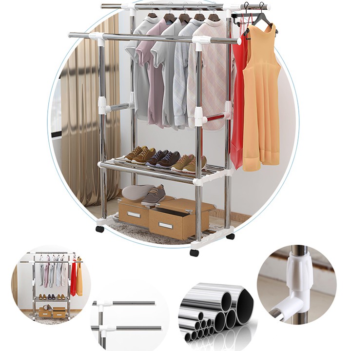 Giàn phơi quần áo, treo đồ 2 tầng inox có bánh xe đa năng, cây phơi quần áo tiện dụng TT-HOME