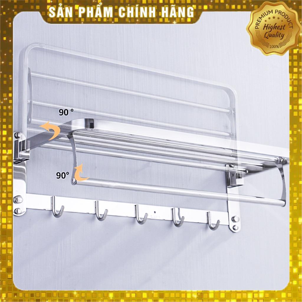 Giàn treo khăn còn được gắn thêm 6 móc treo bên dưới giúp bạn treo móc được nhiều vật dụng khác nhau. Đặc biệt, kệ để đồ bên trên có thể lật lên 90 độ để tiết kiệm diện tích khi không sử dụng.