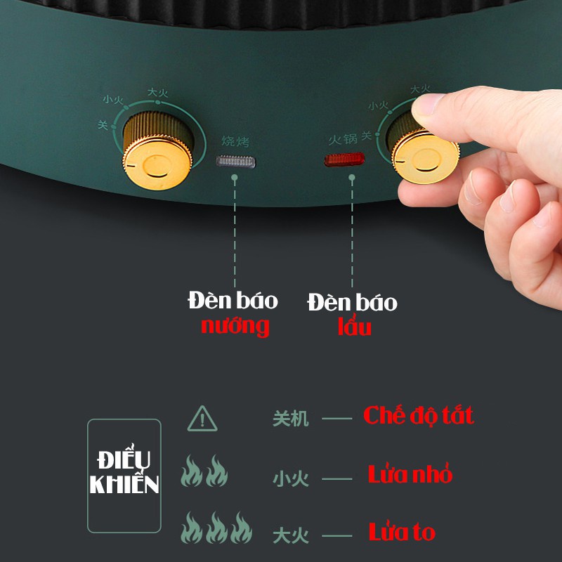👉Được trang bị nút điều chỉnh nhiệt tiện lợi, cho phép bạn tùy chỉnh mức nhiệt độ cung cấp cho món ăn mọi lúc theo mong muốn để những món nướng được vàng đều hai mặt, thơm ngon và nồi lẩu vẫn được nóng hổi, hấp dẫn.
