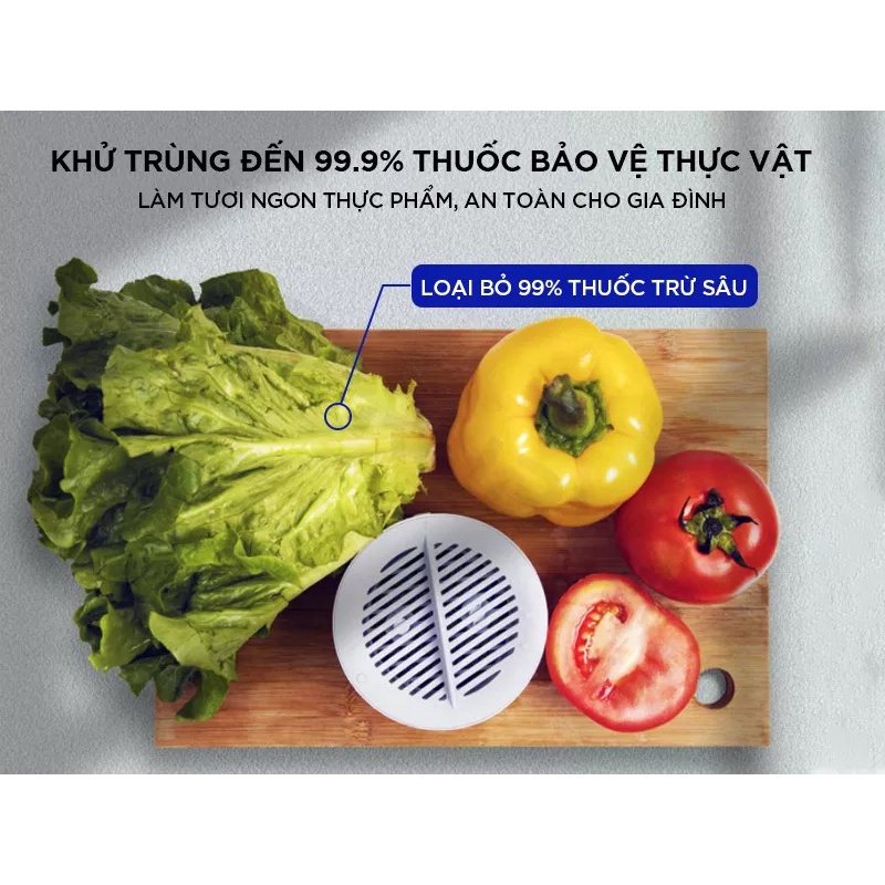 - Máy khử trùng rau quả có hiệu quả khử khuẩn lên đến 99.9% và khả năng loại bỏ 90% hóa chất thuốc trừ sâu trong rau quả, giúp bạn có thể yên tâm ăn những rau quả thơm ngon, an toàn với sức khỏe.