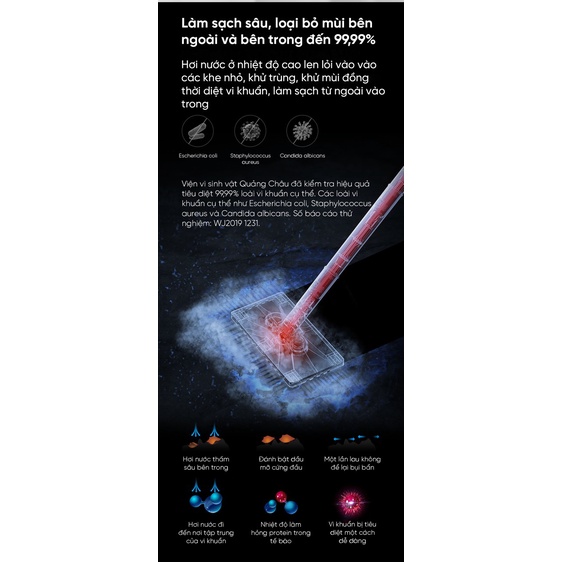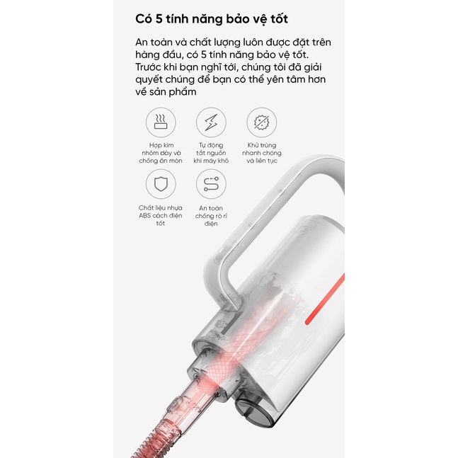 Khả năng làm sạch, khử trùng tối ưu: Chỉ mất 20 giây để làm nóng với nhiệt độ lên đến 150 độ C, đây là cơ chế hoạt động làm nóng hơi nước và khử trùng hiệu quả được đánh giá cao của máy làm sạch Deerma ZQ600. Khả năng làm nóng hơi nước tức thời, tạo nguồn cung cấp hơi nóng liên tục với áp suất cao. Từ đó cho hiệu quả thâm nhập sâu từ ngoài vào trong mọi bề mặt, tiêu diệt đến 99.9% vi khuẩn, làm sạch hoàn toàn mọi vết bẩn cứng đầu. Hơi nước nóng với cường độ cao, cùng công suất hoạt động mạnh mẽ 1600W không chỉ hoạt động như một chất tẩy rửa thân thiện với môi trường, làm sạch an toàn mà còn có khả năng đánh bay vi khuẩn, làm phẳng các nếp gấp trong vải, sofa, rèm cửa,…