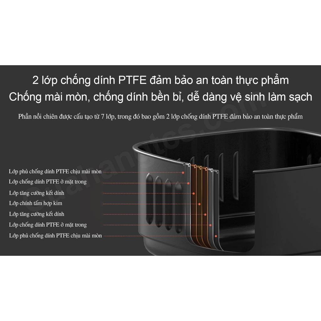 Về kích thước, nồi chiên không dầu Mijia có kích thước nhỏ gọn 335 x 252 x 304mm, được gia công từ vật liệu hợp kim. Phần nồi chiên được cấu tạo từ 7 lớp, trong đó bao gồm 2 lớp chống dính PTFE đảm bảo an toàn thực phẩm. Nồi có dung tích 3.5L có thể đáp ứng nhu cầu sử dụng của 1 đến 5 người.