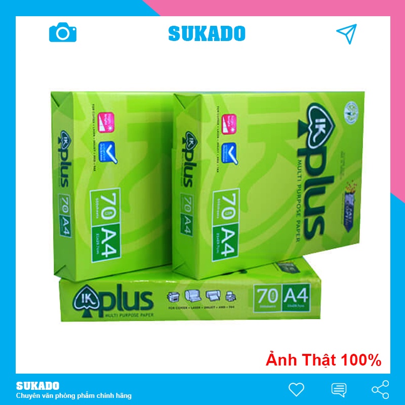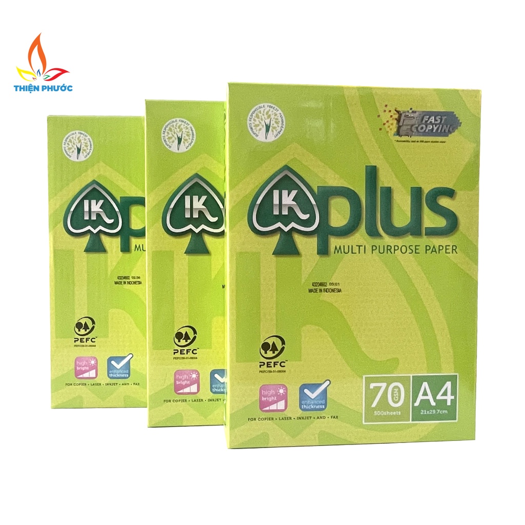 - Giấy A4 IK Plus 70gsm là loại giấy in photo khá phổ biến và được khách hàng ưa chuộng hiện nay vì định lượng và độ dày phù hợp với các dòng máy in hiện đại, sử dụng giấy in A4 IK Plus 70gsm bạn sẽ không phải lo lắng về chất lượng các bản in, kẹt giấy khi in hay nhòe chữ.