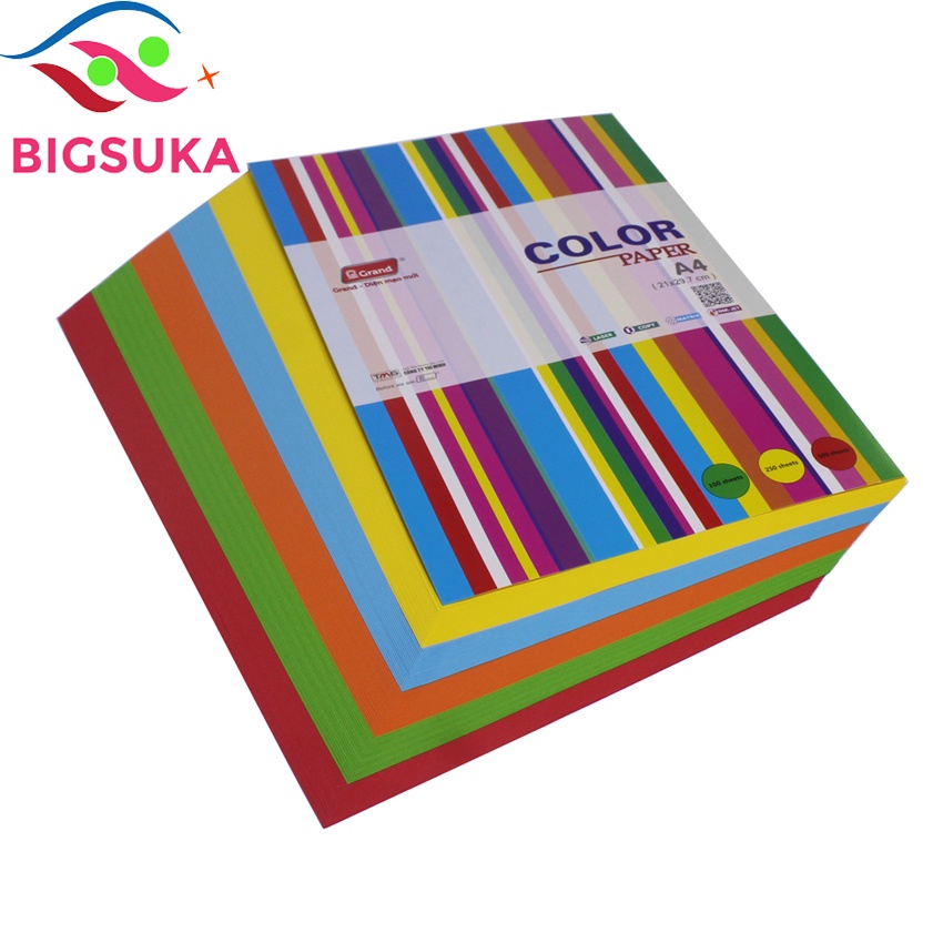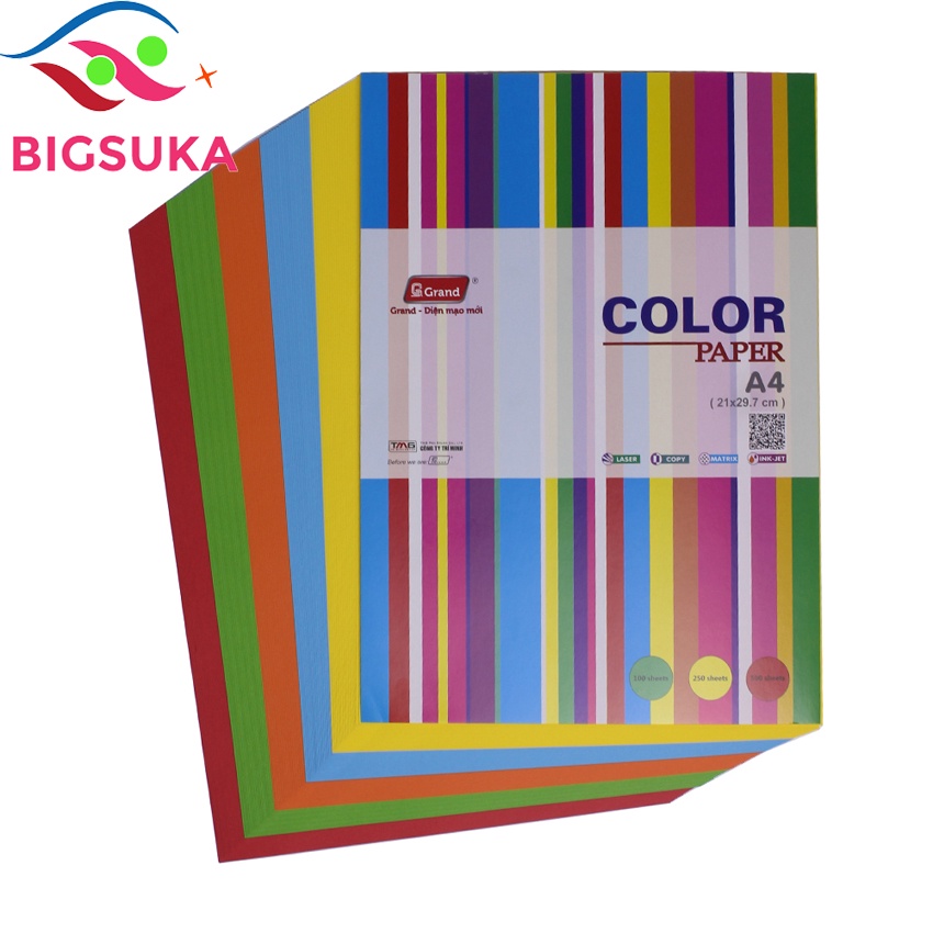 Giấy A4 màu Grand 5 màu trộn - Xấp 100 tờ/5 màu BIGSUKA- Giấy photo A4 màu Grand Với hai mặt giấy láng mịn phù hợp với tất cả các loại máy in phun, máy in Laser, máy Fax laser, máy Photocopy, đặc biệt hơn là có thể in đảo 2 mặt mà không lo kẹt giấy cho phép in ra những văn bản và hình ảnh tuyệt đẹp với độ rõ nét cực cao.