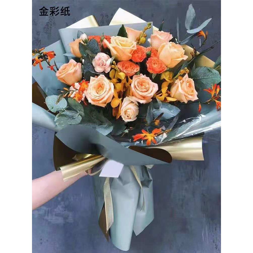 Giấy gói hoa 2 mặt, 1 mặt màu, 1 mặt màu nhũ đồng, phối lên hoa cực kỳ điểm nhấn và ấn tượng bởi sự pha trộn màu sắclựa chọn, màu hoa và màu nhũ đồng ánh kím