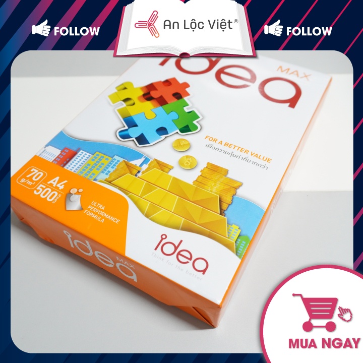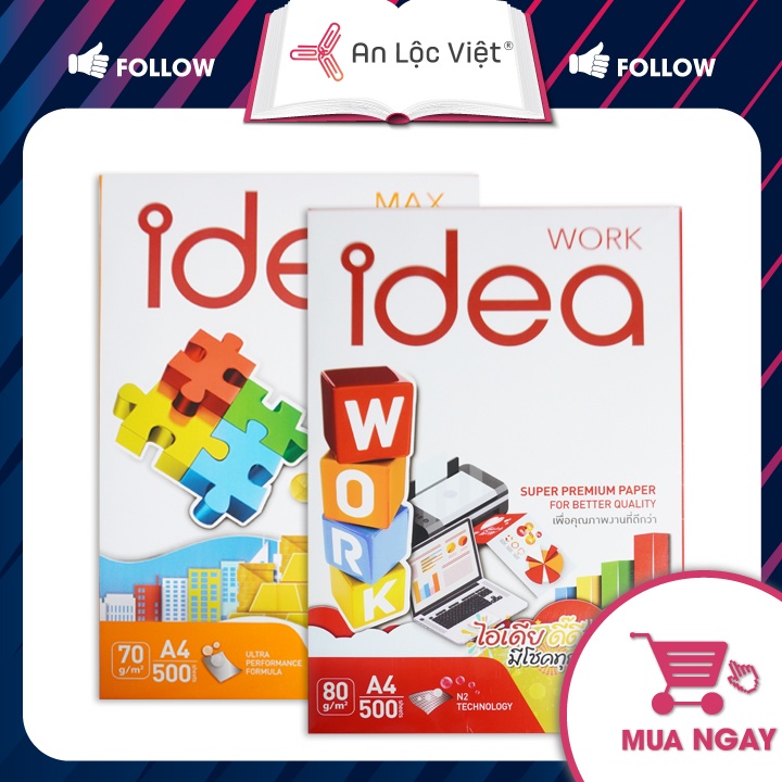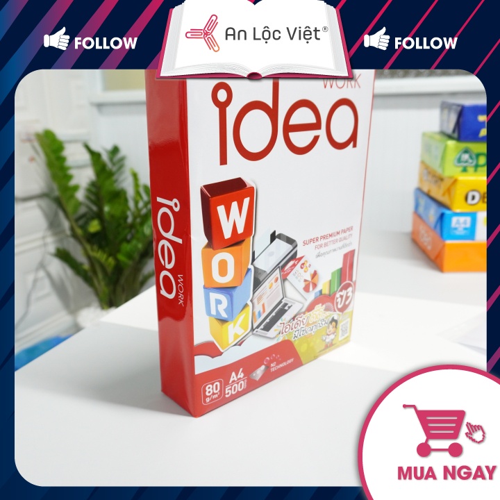 - Giấy A4 70gsm, 80gsm Idea là loại giấy in photo chuyên sử dụng cho máy in laser, máy photocopy, được sản xuất theo công nghệ sản xuất giấy hiện đại nhất, được nhập khẩu từ Thái Lan. An Lộc Việt luôn cung cấp đến bạn các sản phẩm giấy in photo chất lượng và giá thành rẻ nhất.