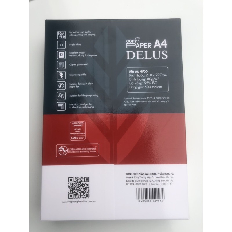 Giấy in A4 Delus định lượng 80 giúp bạn không lo bị cuộn giấy, giấy có độ dày cao giúp cho máy in bền hơn. giấy trắng, đanh phù hợp in các hợp đồng, quyết định hoặc văn bản quan trọng nâng tầm giá trị công ty bạnGiá HT