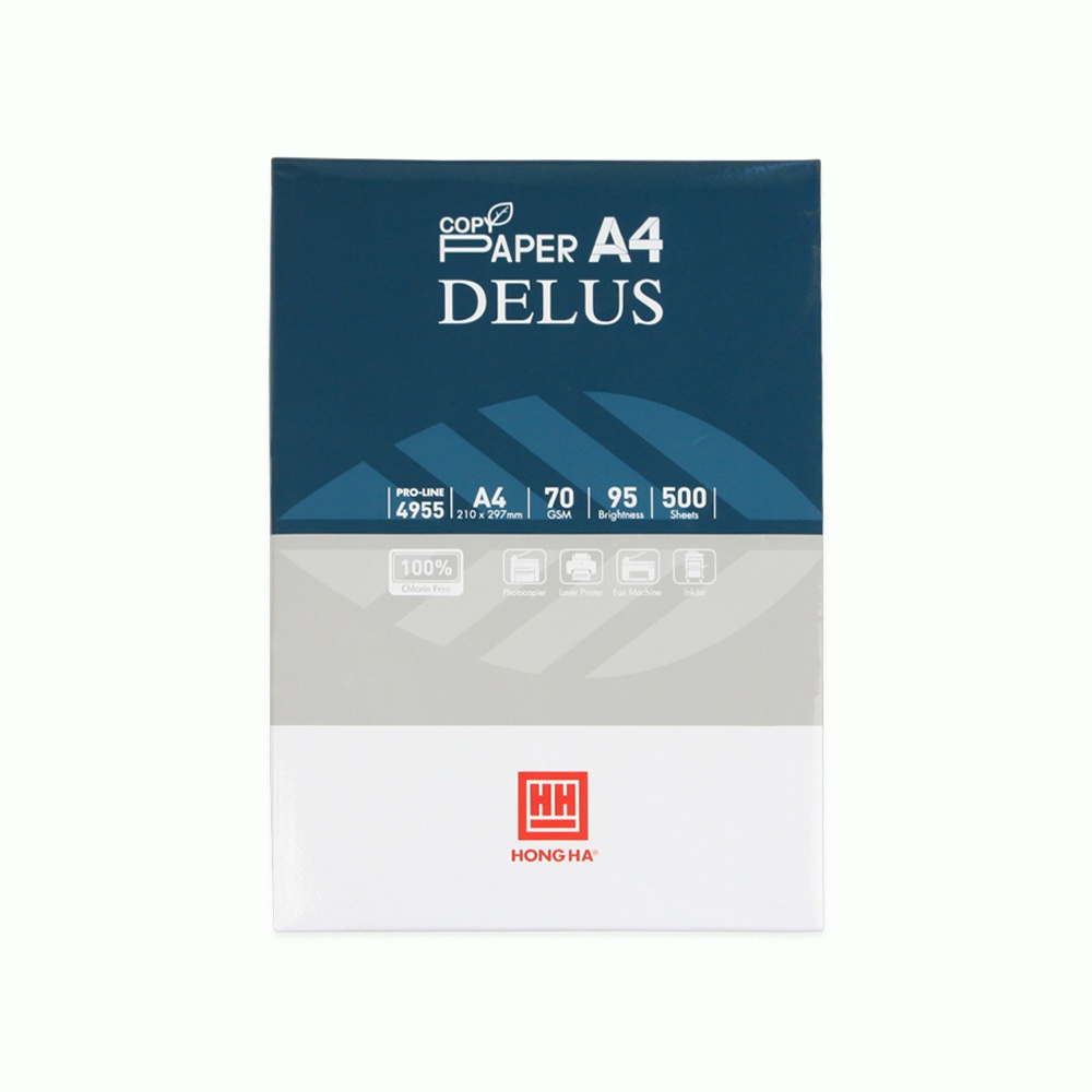 Giấy in A4 Delus Hồng Hà 70gsm 4955 là sản phẩm giấy xuất xứ từ Indonesia, được sản xuất với công nghệ tiên tiến, hiện đại, đóng gói bằng dây chuyền hoàn toàn tự động.