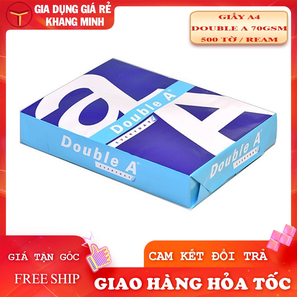 KMV Mart - Khang Minh Vũ phân phốiThông Số Kỹ Thuật Thương hiệu Double Kích thước A4 Định lượng 70 gsm Quy cách 500 tờ / ream Bảo quản Nhiệt độ: 10 ~ 55º C, Độ ẩm: 55 ~ 95% RH, Tránh xa nguồn nhiệt, dầu mỡ. TÍNH NĂNG NỔI BẬT Giấy Double A A4 - 70gsm là loại giấy in cao cấp, trắng, đẹp, thích hợp với tất cả các loại Máy in phun, Máy in Laser, Máy Fax laser, Máy Photocopy. In đảo 2 mặt không lo kẹt giấy. Giấy được đóng gói và nhập khẩu từ Thailand nên Giấy Double Công nghệ sản xuấn hiện đại làm giấy trông mỏng nhưng thực tế giấy đã được nén chặt hơn, làm bề mặt của giấy nhẵn, đều hơn, giúp bạn có thể in ấn hoặc photocopy cả hai mặt mà không bị nhăn, cong giấy hay mực bị lem, thấm ngược, không tạo ra bụi giấy, giúp mực khô nhanh hơn, không bị nhòe, tạo nên văn bản sắc nét với màu đen đậm hơn. Giấy thích hợp cho nhiều loại máy văn phòng. Bảo quản: Nhiệt độ: 10 ~ 55º C. Độ ẩm: 55 ~ 95% RH. Tránh xa nguồn nhiệt, dầu mỡ.