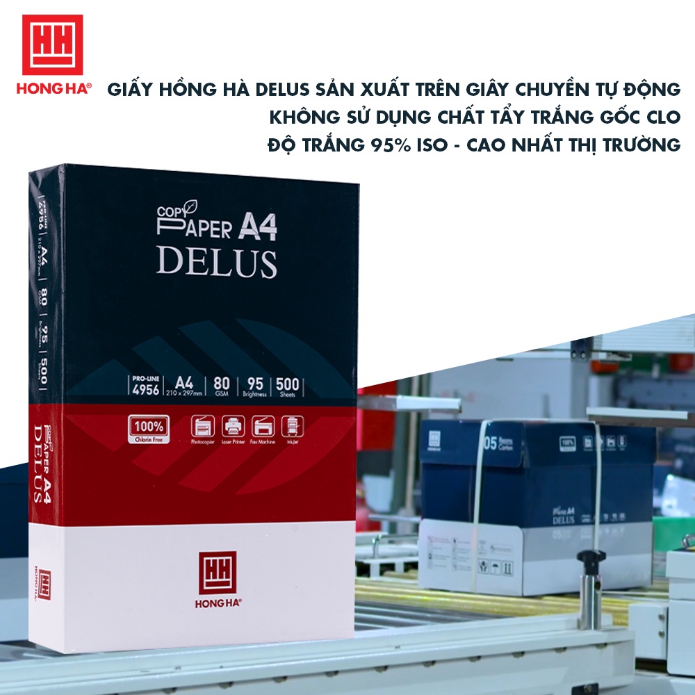 - Giấy in A4 Hồng Hà Delus được sản xuất trên dây chuyền tự động hiện đại bậc nhất Việt Nam giúp giảm chi phí sản xuất và tăng năng suất, đáp ứng nhu cầu in ấn của thị trường.
