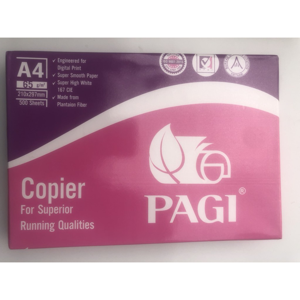 Giấy A4 Pagi định lượng 65 là nhãn hiệu giấy in photo cao cấp, chất lượng giấy rất tốt, có những ưu điểm về độ trắng sáng, độ sắc nét trong in ấn.Giấy A4 Pagi 65 gsm là loại giấy in photo phổ biến và thông dụng trong các văn phòng công ty hiện nay, sử dụng để in photo đóng thành cuốn hoặc dùng làm phiếu thu - chi - xuất - nhập - đơn đặt hàng.