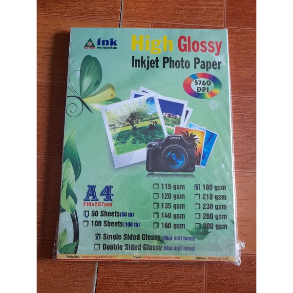 Dòng giấy in ảnh bóng láng được phủ thêm thuốc nên có thể in bằng máy in phun màu, Giấy in ảnh có mặt sau và mặt trước bóng láng bắt mực tốt làm cho bản in sắc nét, tươi và chi phí giảm hơn nhiều so với giấy lab.Giấy in ảnh 1 mặt bóng khổ A4. Dòng giấy in ảnh bóng láng được phủ thêm thuốc nên có thể in bằng máy in màu, Giấy in ảnh có mặt sau sần, mặt trước bóng láng bắt mực tốt làm cho bản in sắc nét, tươi và chi phí giảm hơn nhiều so với giấy lab. Giấy in ảnh 1 mặt bóng khổ A4 được dùng để in film, in tranh, in ảnh, in poster trang trí ....