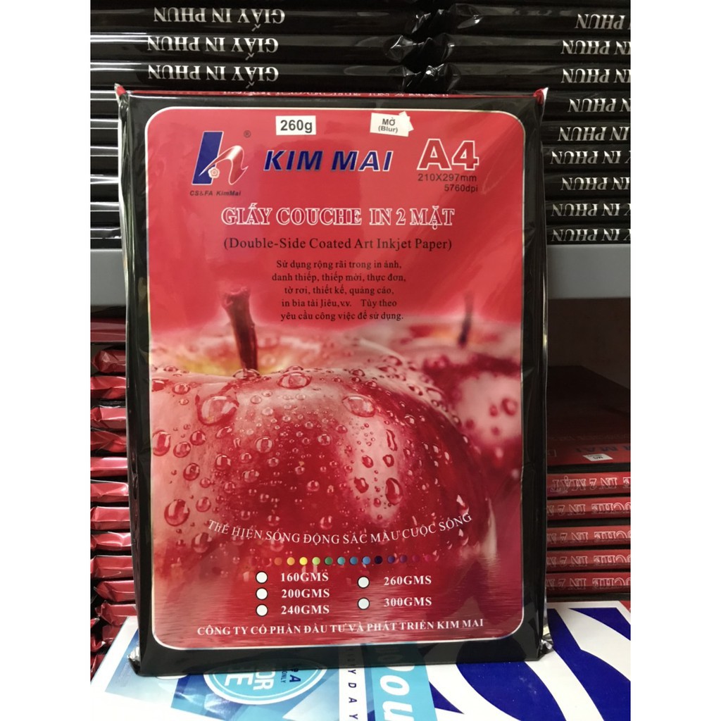 Giấy in ảnh kim mai 260gms bóng 2 mặt_Giấy in ảnh 2 mặt là loại giấy có tráng phủ lên bề mặt một lớp hợp chất vô cơ, chủ yếu để ngăn mực in phun không bị loang trong giấy, giúp bản in có được màu sắc chính xác, trong trẻo, sắc sảo, nét và bền lâu với thời gian. Được sản xuất theo công nghệ cao, chất liệu giấy đẹp, độ bóng tốt, in ảnh đẹp ít bay màu mực nên loại giấy in ảnh này được thiết kế đặc biệt cho các loại máy in phun, thường có thể nhận biết thông qua định lượng, độ sáng, độ mịn, độ đục của tờ giấy và được dùng để in ảnh kỹ thuật số, ảnh gia đình, in ảnh kinh doanh, quảng cáo, in thiệp, in menu ...