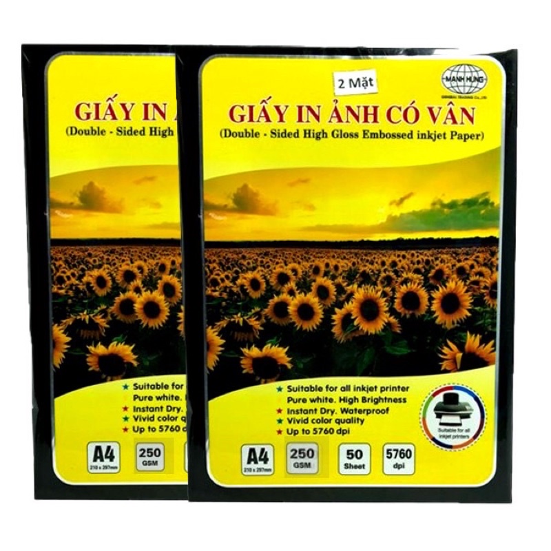 Giới thiệu Giấy in ảnh Mạnh Hưng khổ A4 định lượng 250 gsm 50 tờ/g 2 mặt vân, giấy in couche in phun