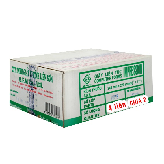 Giấy Vi Tính Liên Sơn 4 Liên (240 x 279 mm) chia 2 (size A5) được sản xuất từ nguyên liệu giấy ngoại nhập từ Indonesia, bề mặt giấy láng đều, không có bụi giấy, không bị kẹt giấy, ít hao mực.