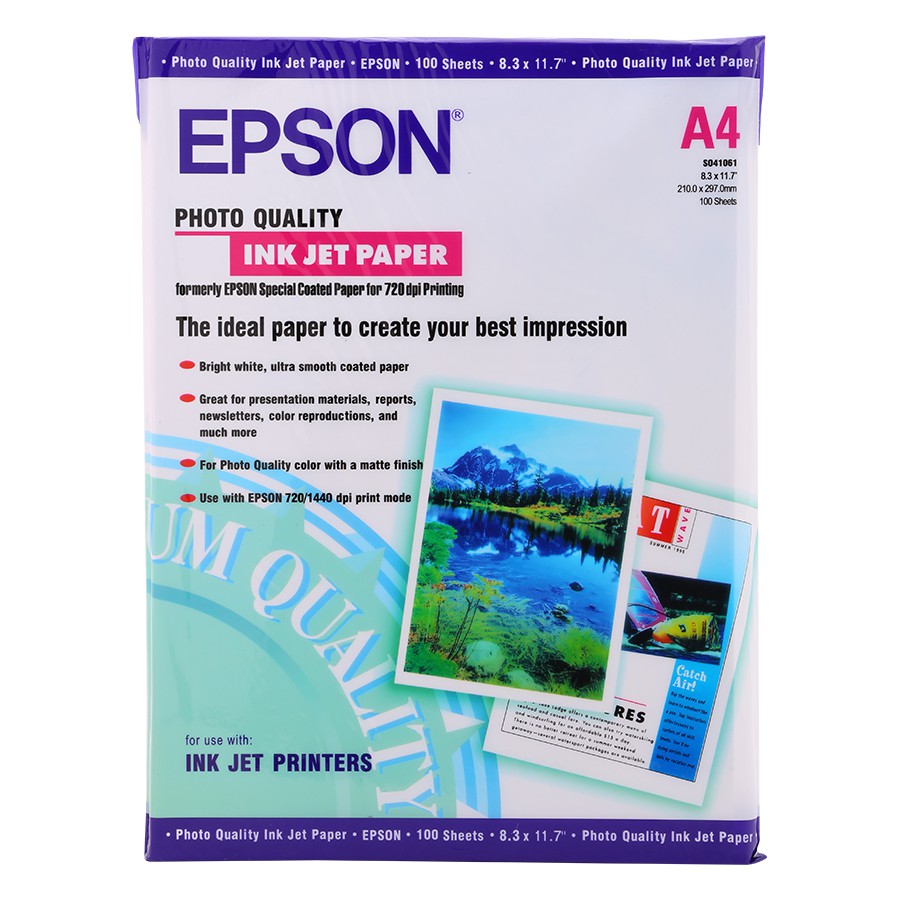 Đặc điểm:- Giấy in phun Epson được sản xuất từ nguyên liệu cao cấp, bổ sung thêm lớp bột phủ và giấy bìa tạo nên chất lượng in ảnh cao, màu sắc rõ nét, không nhòe mực, không bay màu, khô nhanh, chống ẩm, chống nước tốt, giữ màu bền.