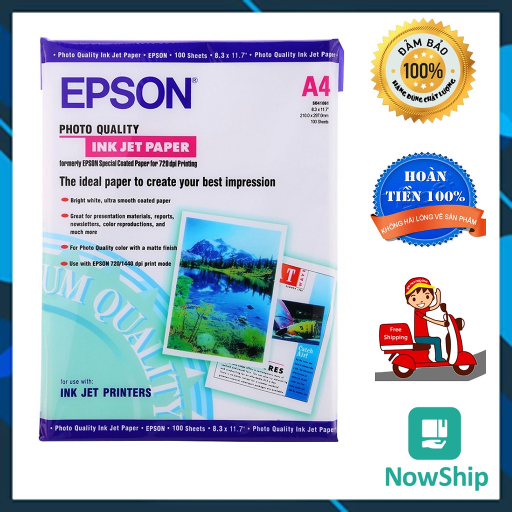 Giấy in màu Epson A4 100 tờ ĐL130gsm- Giấy in phun Epson được sản xuất từ nguyên liệu cao cấp, bổ sung thêm lớp bột phủ và giấy bìa tạo nên chất lượng in ảnh cao, màu sắc rõ nét, không nhòe mực, không bay màu, khô nhanh, chống ẩm, chống nước tốt, giữ màu bền.