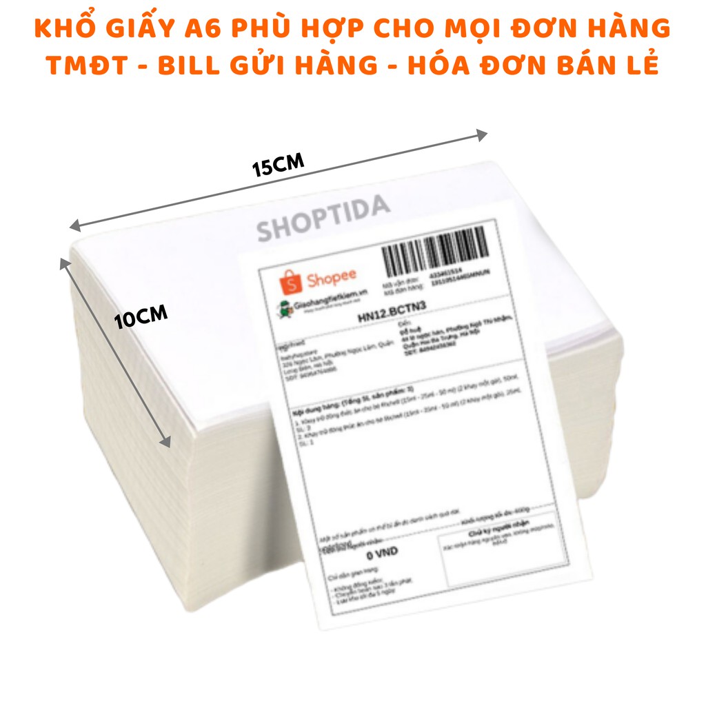 GIẤY IN NHIỆT TỰ DÁN KHÔNG PHAI MÀU CHỮ CHUYÊN DỤNG CHO MÁY IN NHIỆT SP46 CỦA SHOPTIDA KHỔ A6 ( 10X15CM ) - KHỔ GIẤY TIÊU CHUẨN CỦA PHIẾU GỬI SHOPEE.------------------------------------------------------------